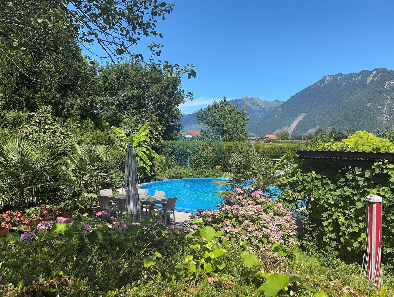 Implantée sur une jolie et généreuse parcelle arborée de 2'793 m2, elle dispose d'une piscine enterrée et jouit d'un bon ensoleillement tout au long de la journée ainsi d'une vue champêtre et sur les montagnes environnantes Les Alpes valaisannes et le Grammont.