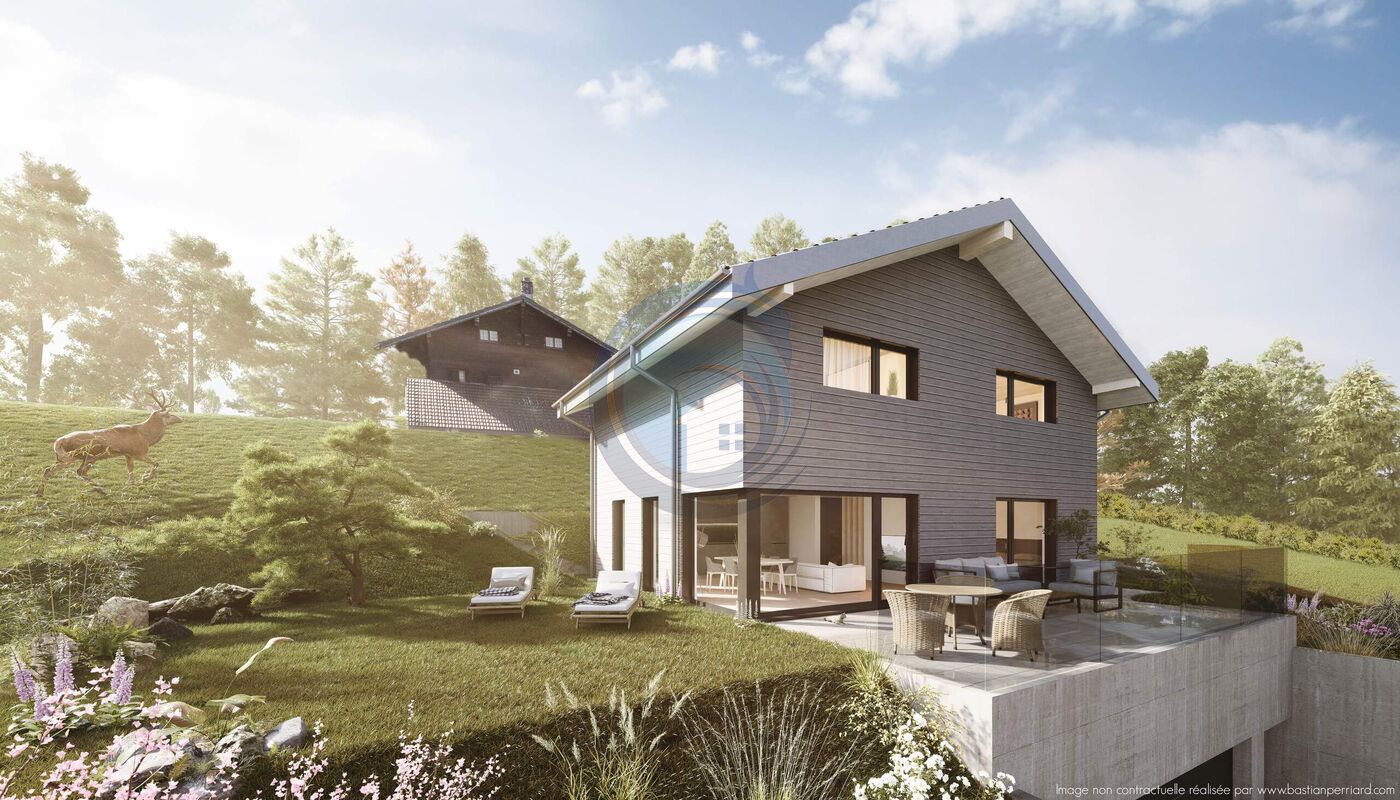 L’image proposée illustre le type d’ambiance et d’architecture possible : un chalet moderne et chaleureux, baigné de lumière, s’intégrant harmonieusement dans un décor alpin avec vue champêtre, grands espaces extérieurs et atmosphère sereine.